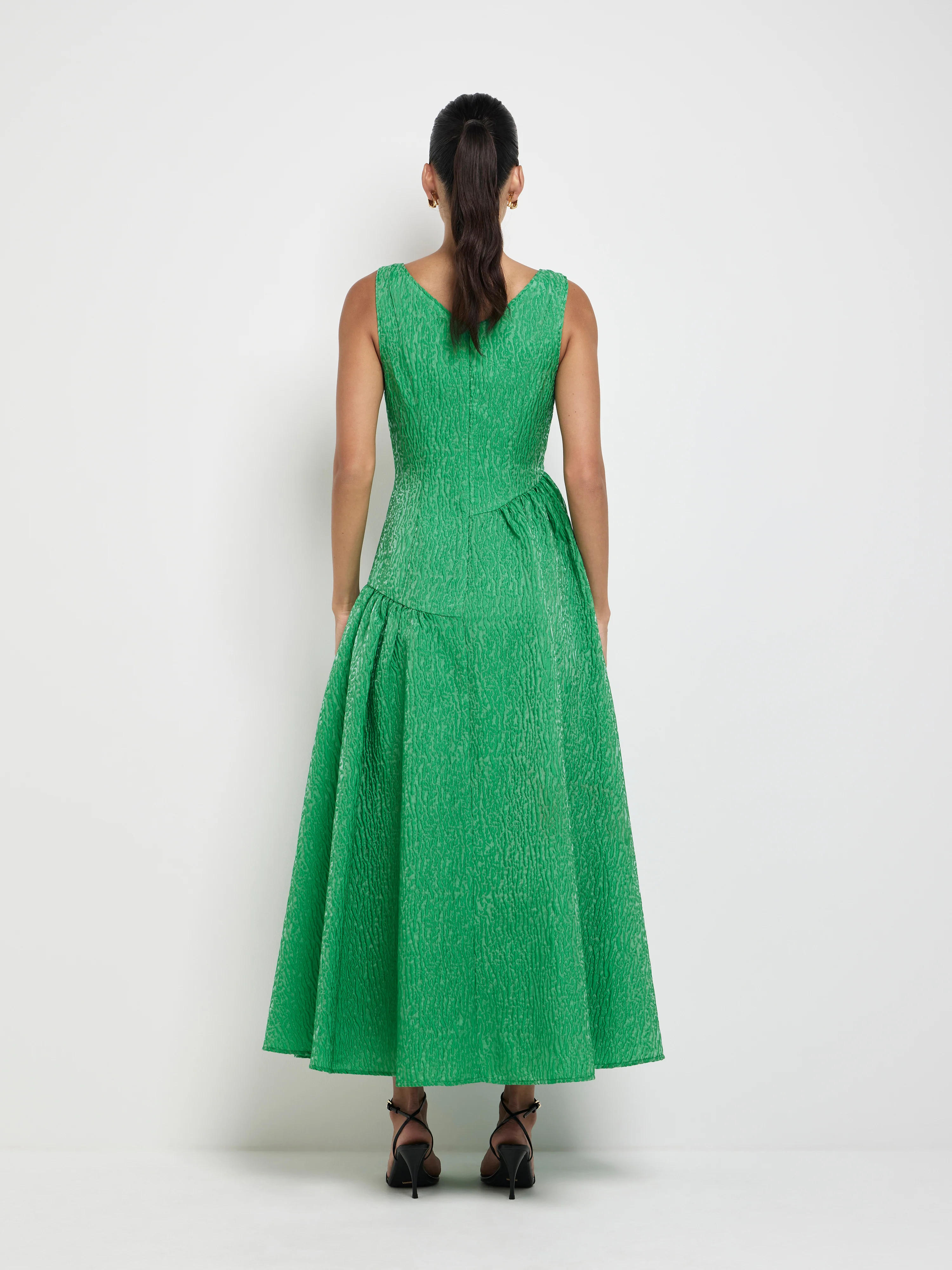 Channel timeless elegance with a twist of texture and a pop of green. Introducing the Alia Dress - featuring a green textured fabrication, fitted bodice with full circle midi skirt, V neckline, asymmetrical bodice seams with gathering and side seam pockets. Pair with our Mitzi Earrings to complete the look.Â