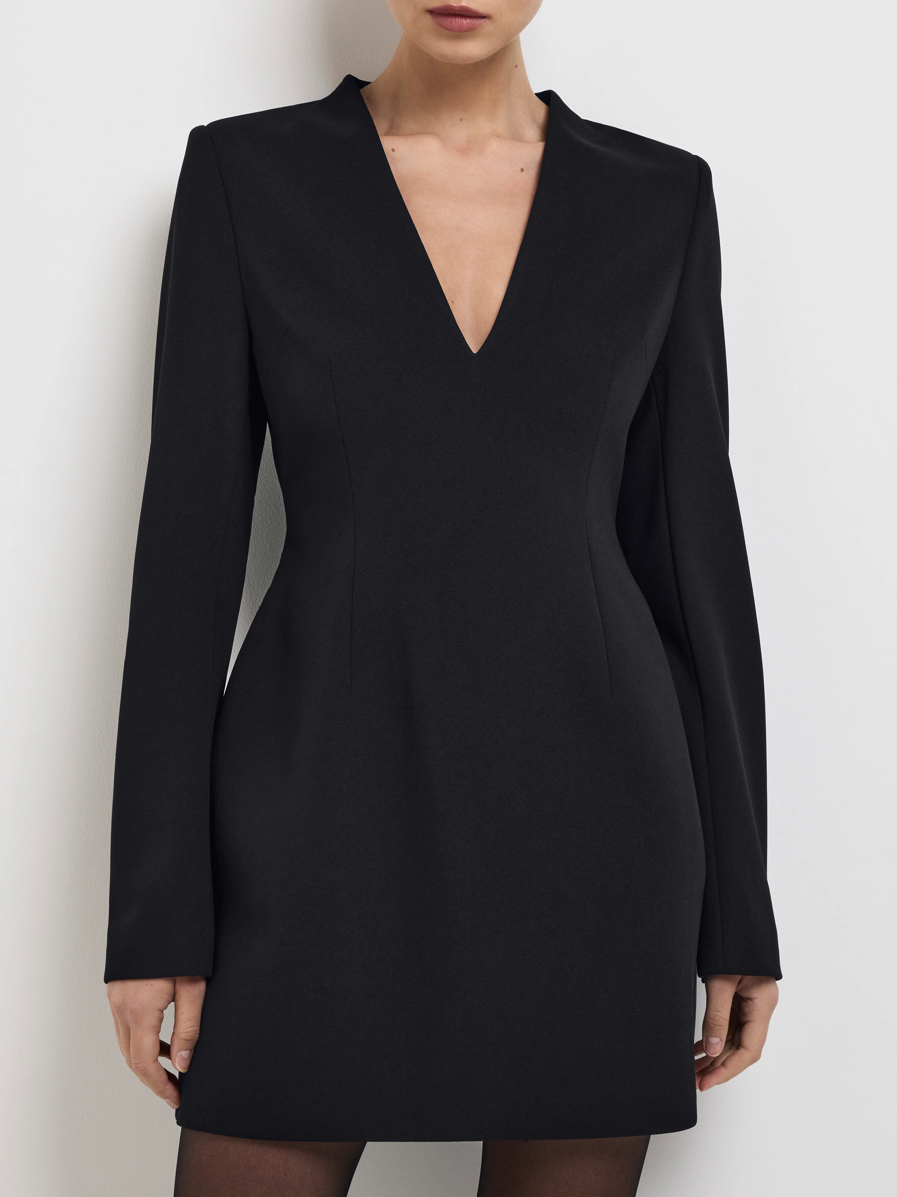 Elevating the little black dress. The Jade Dress showcases a woven bonded fabrication, fitted styling, V neckline, long sleeves with buttons at cuff, shoulder pads and mini skirt length. A statement-making little black dress with an impulse for drama. Pair with the Milano Earrings to complete your look.